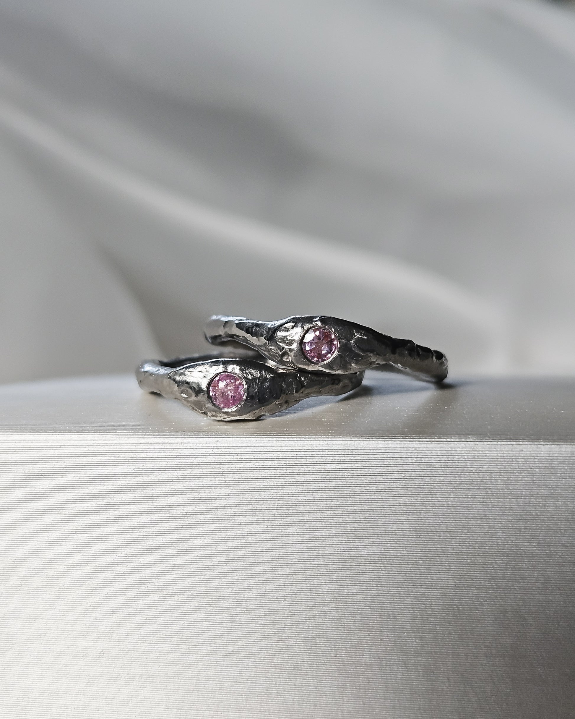 The ring is set with a pink sapphire stone.