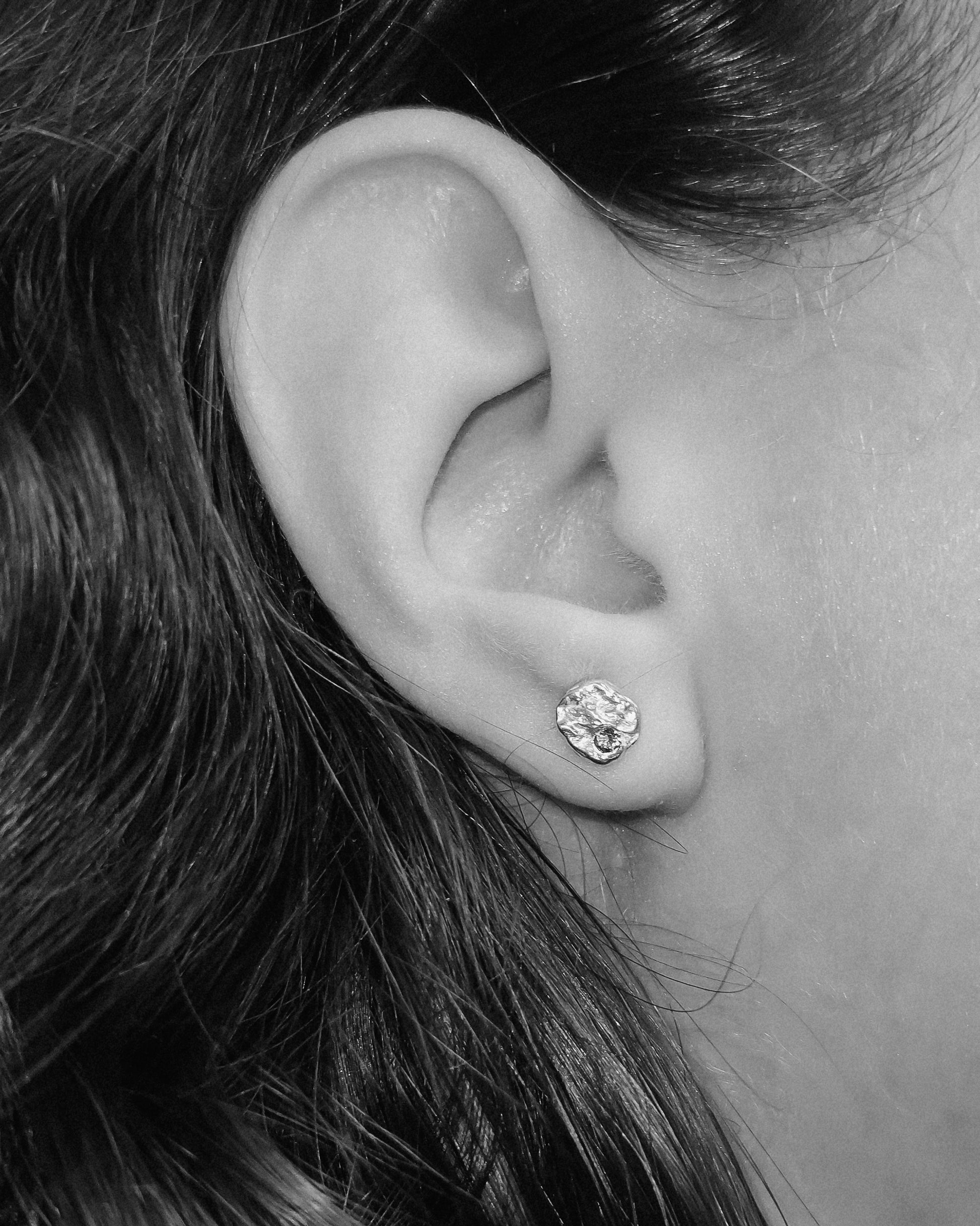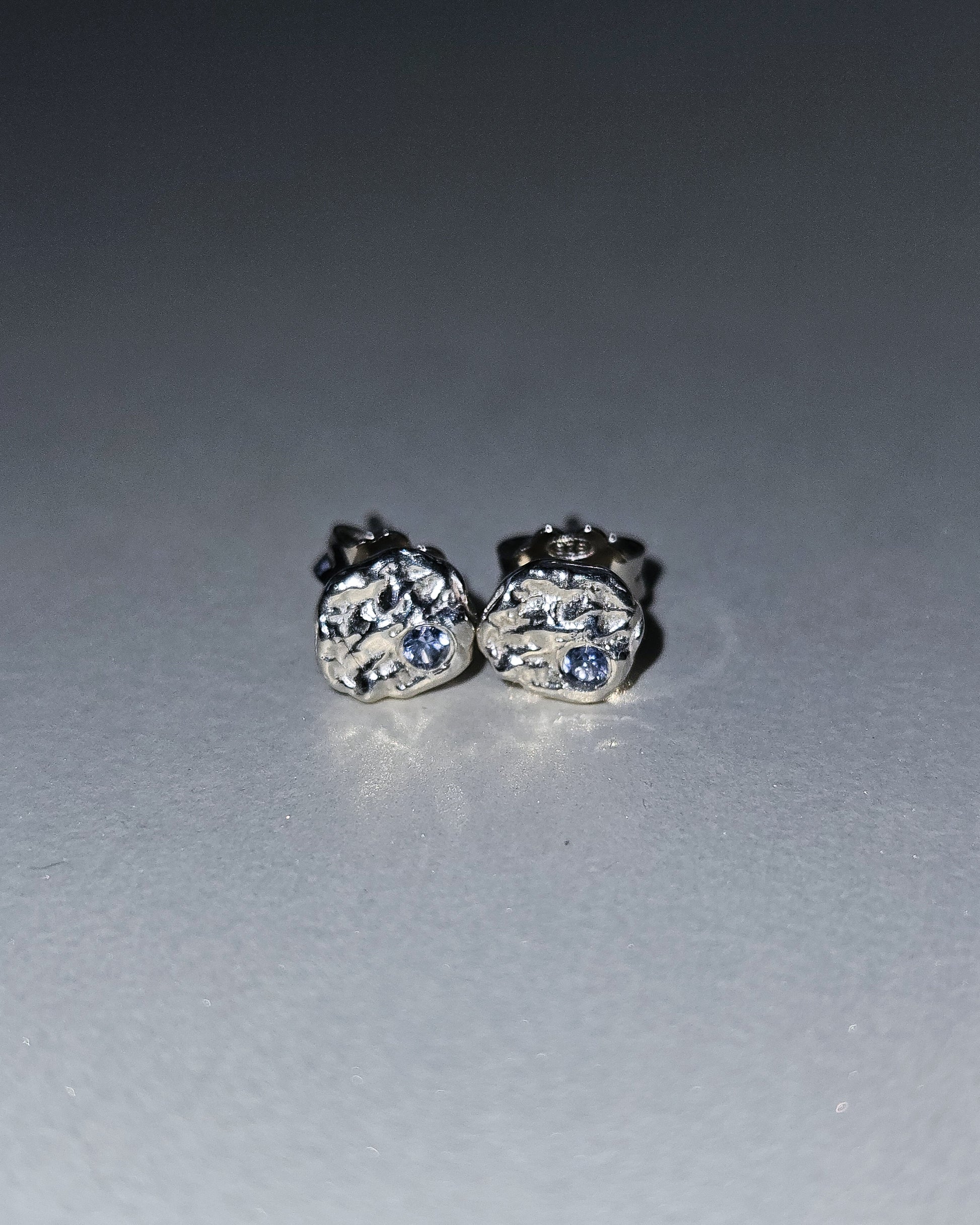 Strata earrings are slightly asymmetrical, with a texture reminiscent of a stone imprint. Earrings are set with a tiny, blue sapphire.